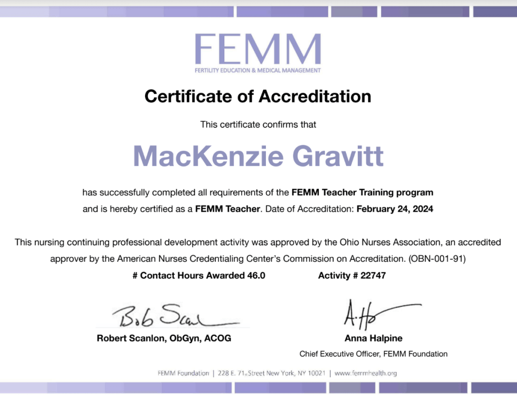 Welcome to Covenant Fertility Education! I’m MacKenzie, an RN and a FEMM certified fertility awareness educator. First and foremost, I teach teen girls and women how to understand and chart their ovulation cycles in order to monitor their health and empower them to become active and knowledgeable participants in their own healthcare. I then help clients connect with restorative reproductive health medical practitioners if needed – doctors that will actually try and get to the root of your fertility and hormonal health concerns!